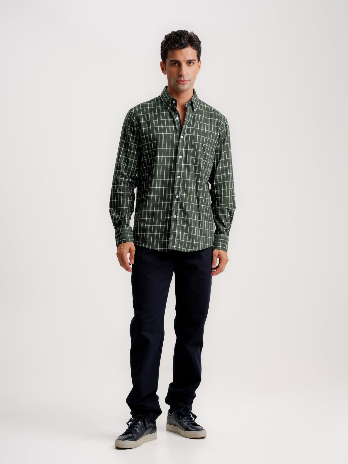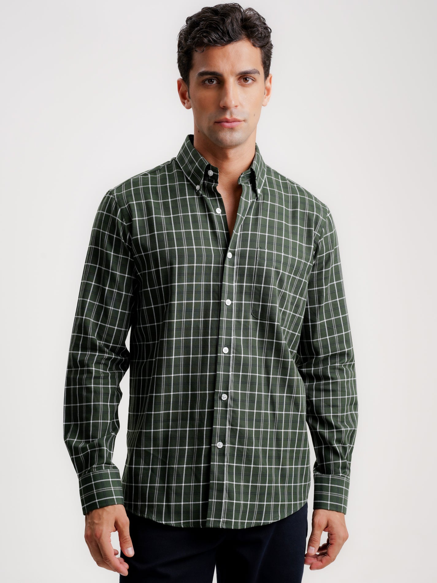 Regular Fit Green Twill Long Sleeve Shirt With Pocket With Squares