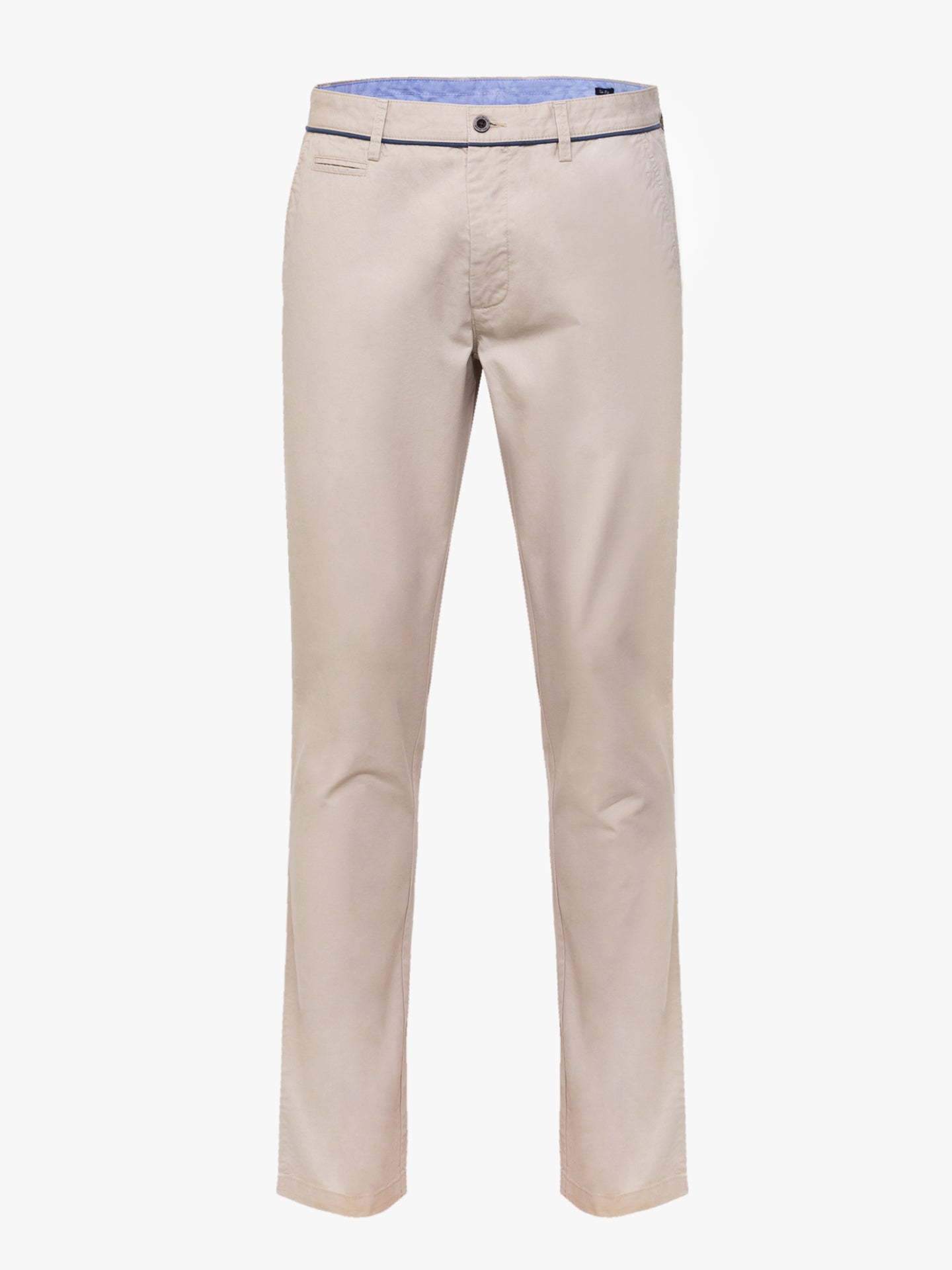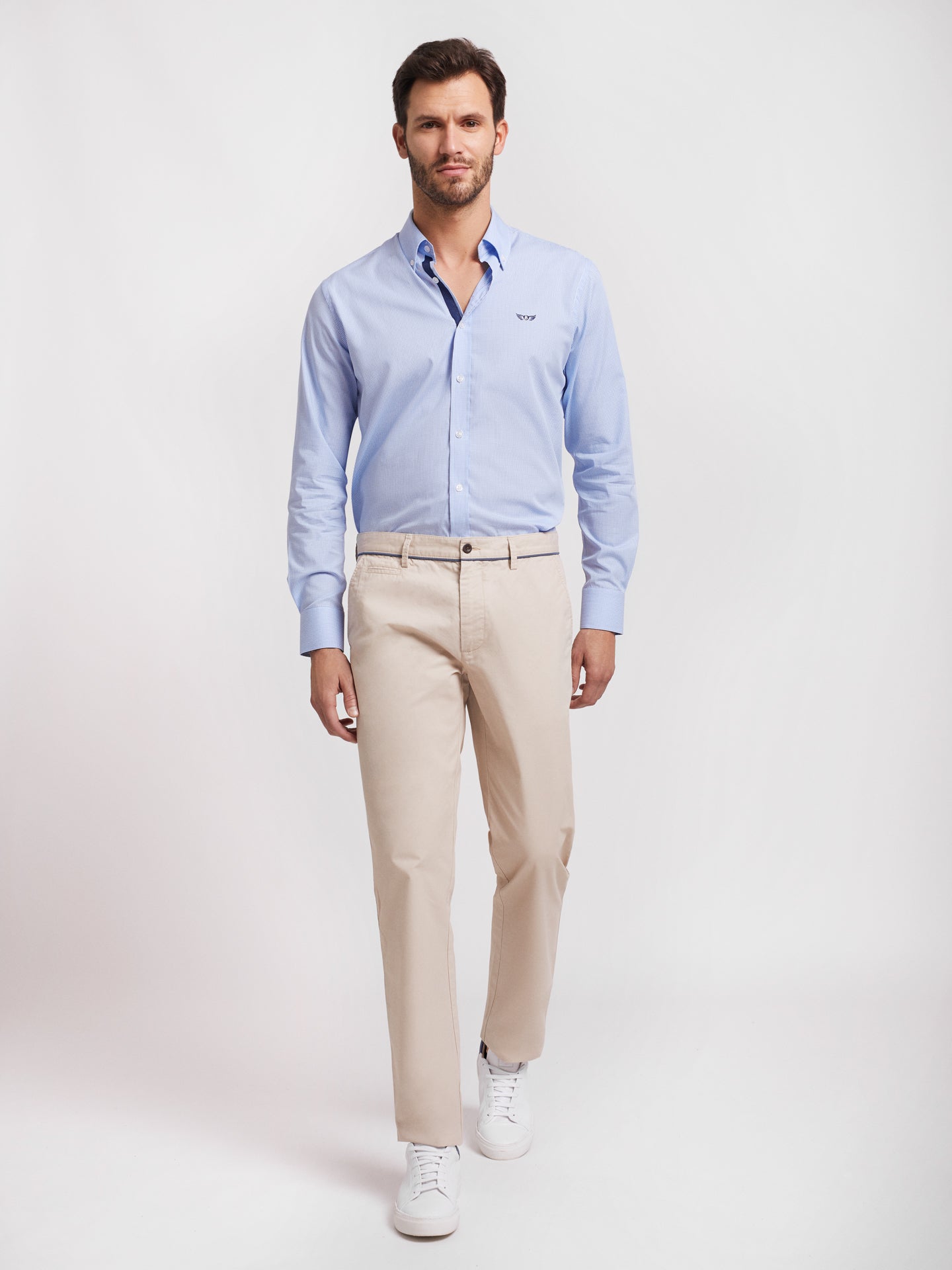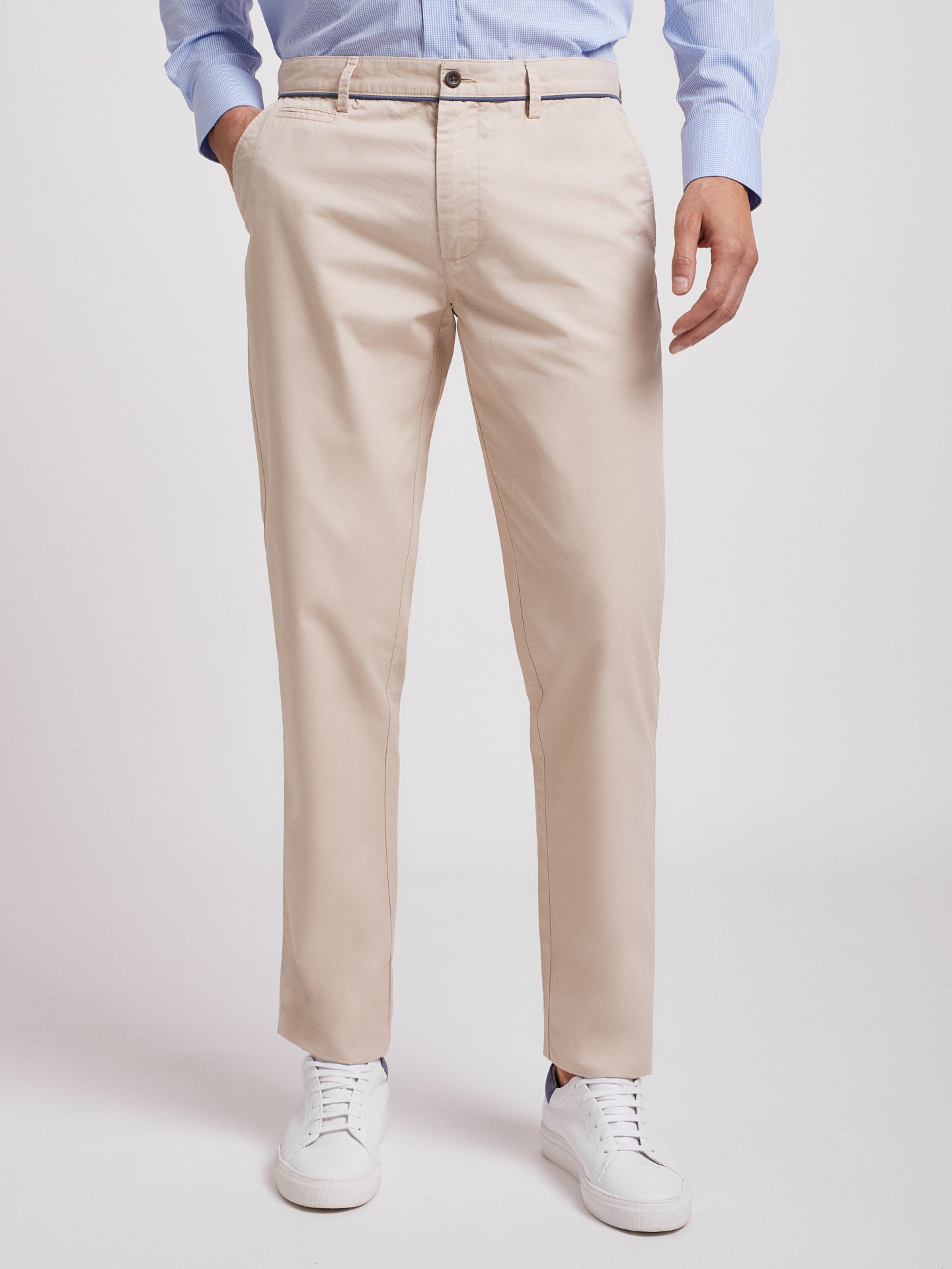 Chino Beige Pants 100% Cotton Man. Cos Cos Detail in Medium Blue. Slim cut, button closure and hidden jail, two side pockets and a small pocket. Two pockets with button house buttoned behind and clips for belt.