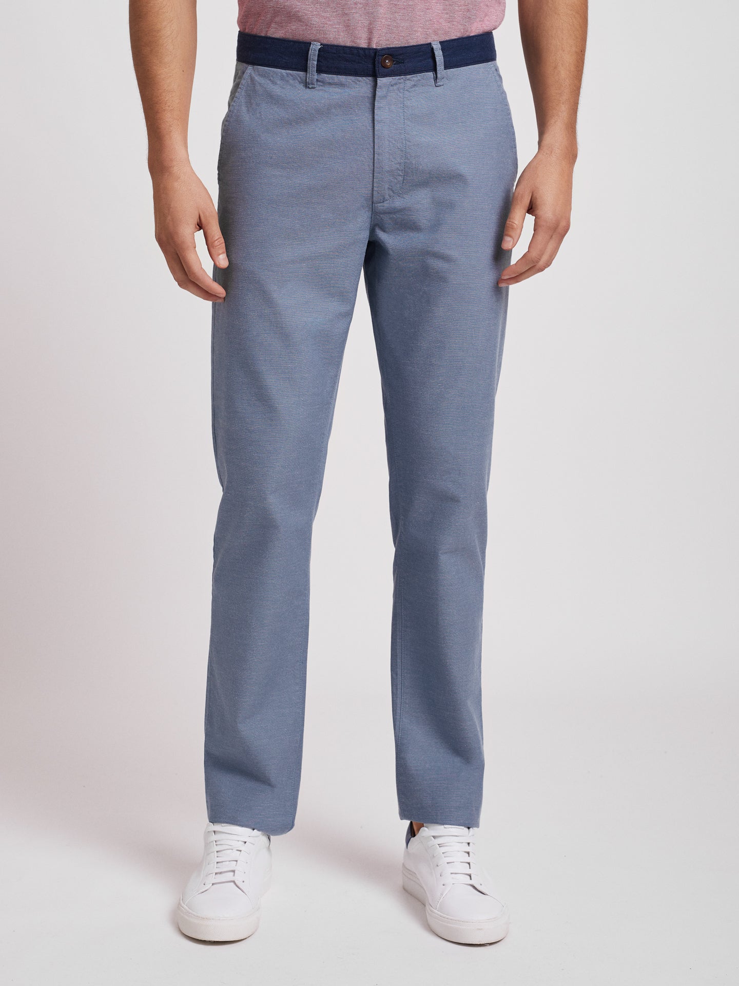 100% cotton men's blue chino pants. Navy blue waistband. Slim cut, button closure and concealed zipper by carcass, two side pockets. Two back buttoned buttonhole pockets and belt loops.