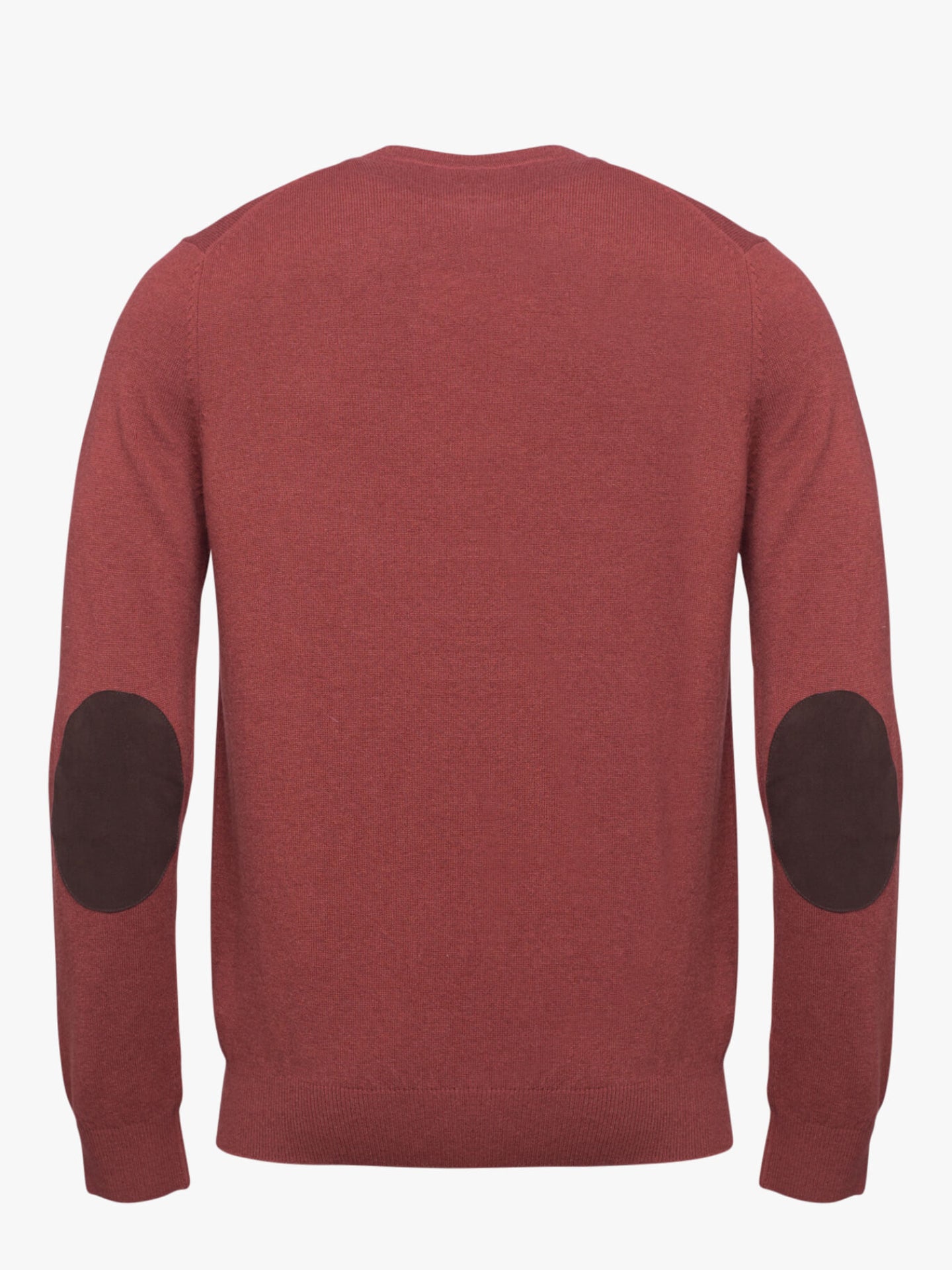 Brick orange men's sweater with dark brown elbow pads. Made of wool. Straight cut, scoop neck, long sleeves and ribbed trims.