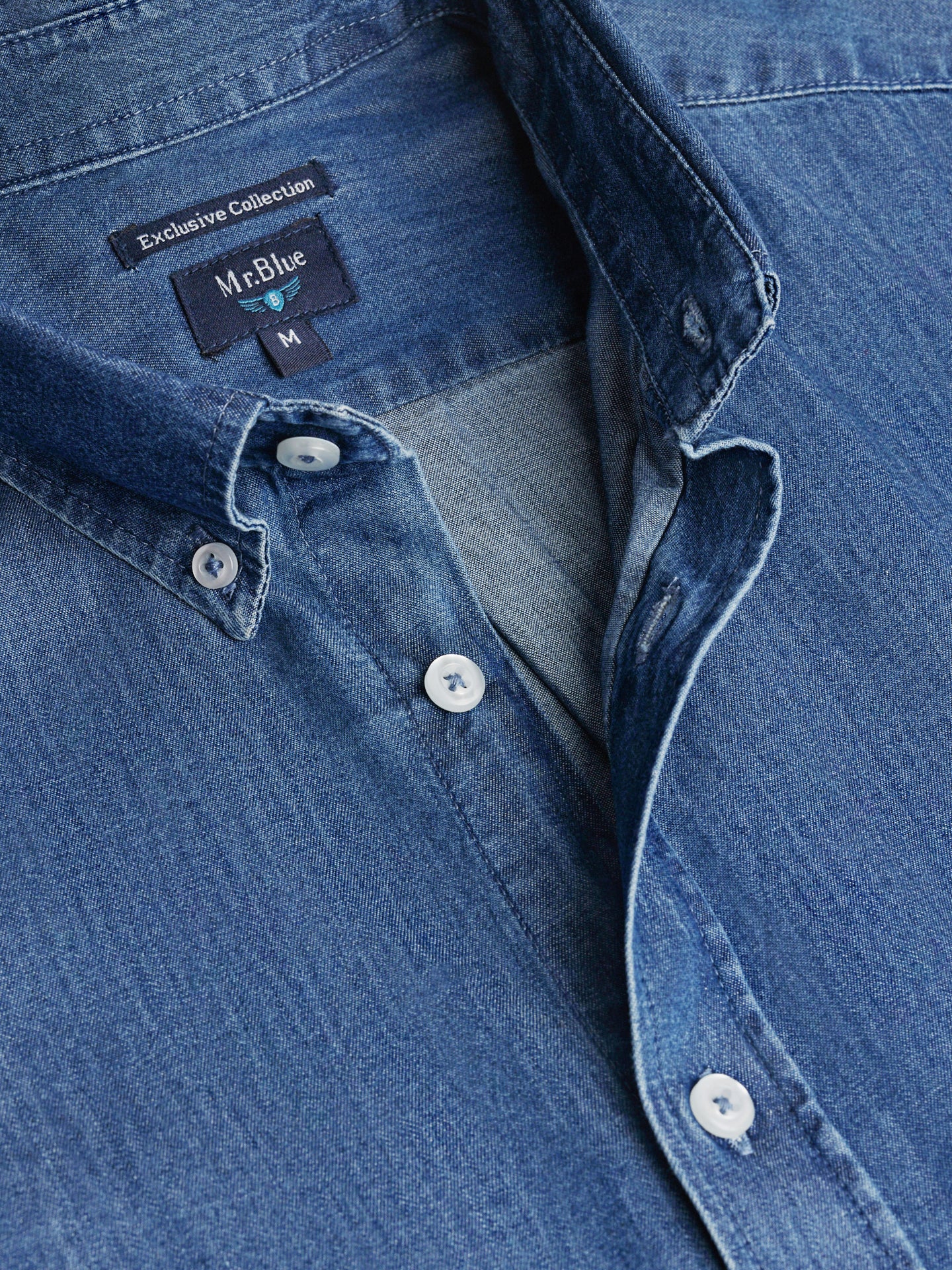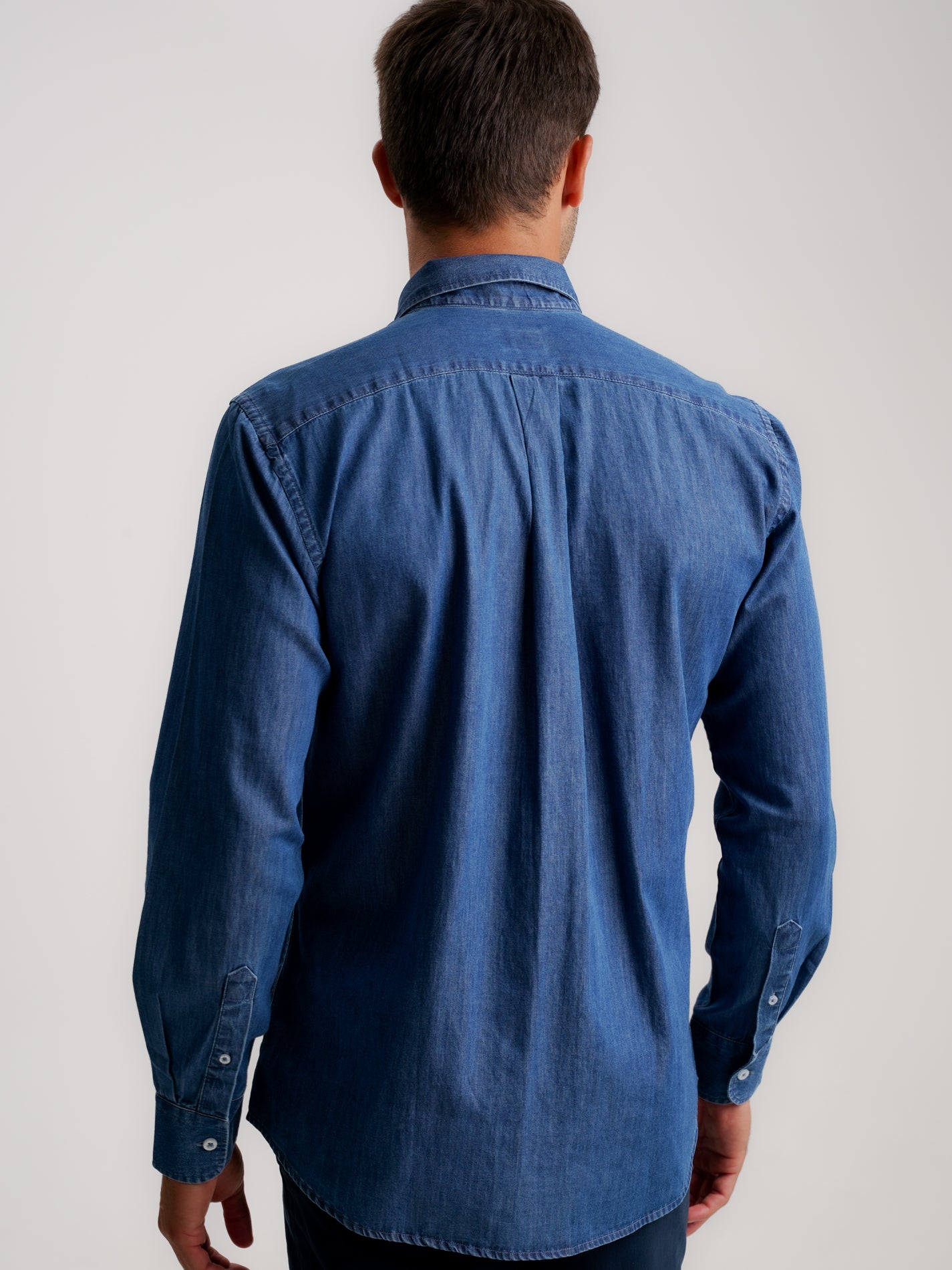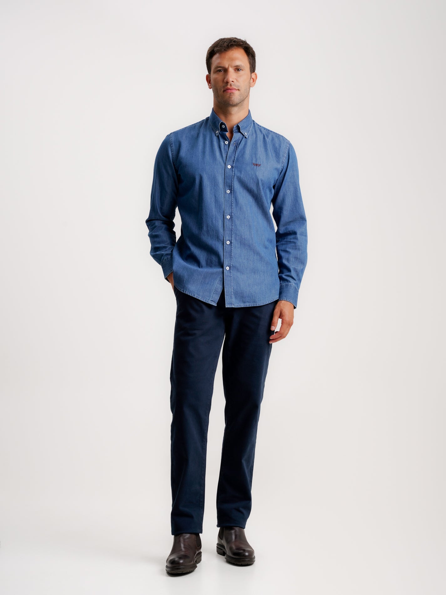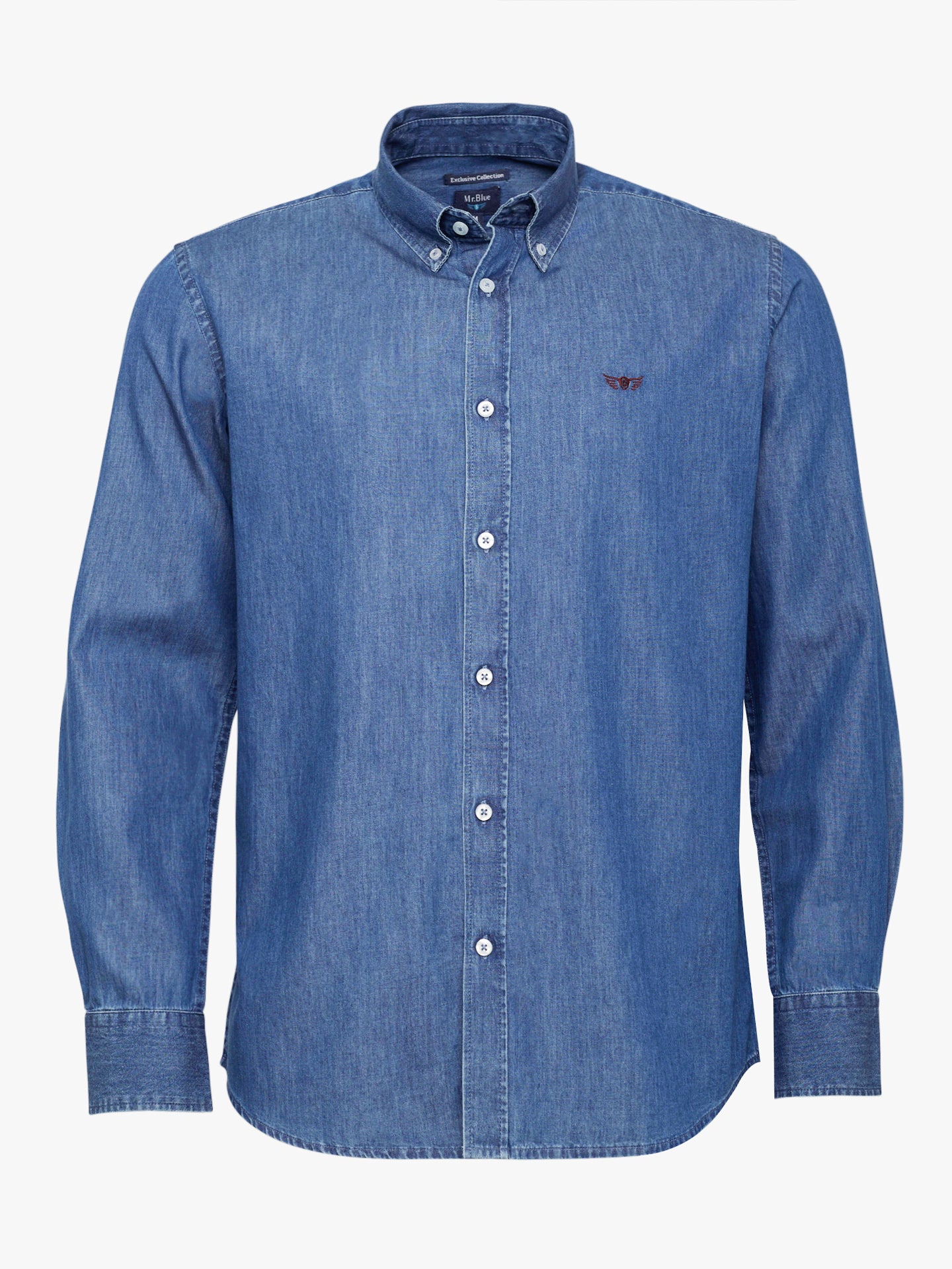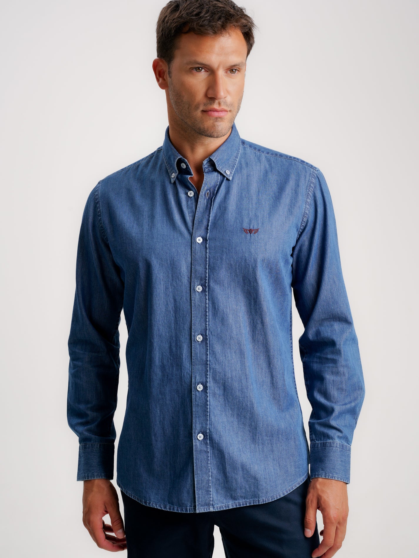 Regular Fit Blue Denim Long Sleeve Shirt With Plain Logo