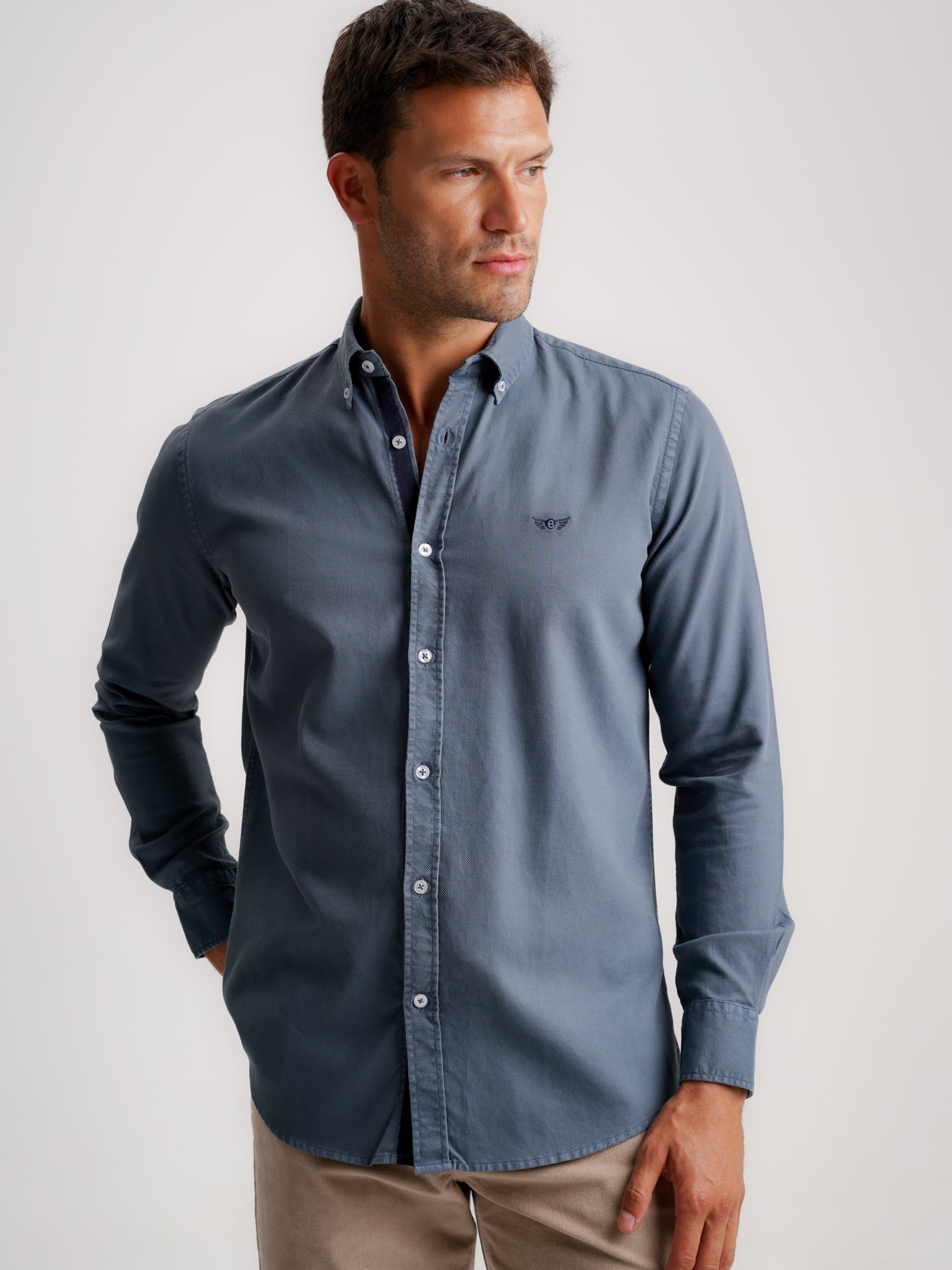 Regular Fit Structured Blue Long Sleeve Shirt With Plain Logo