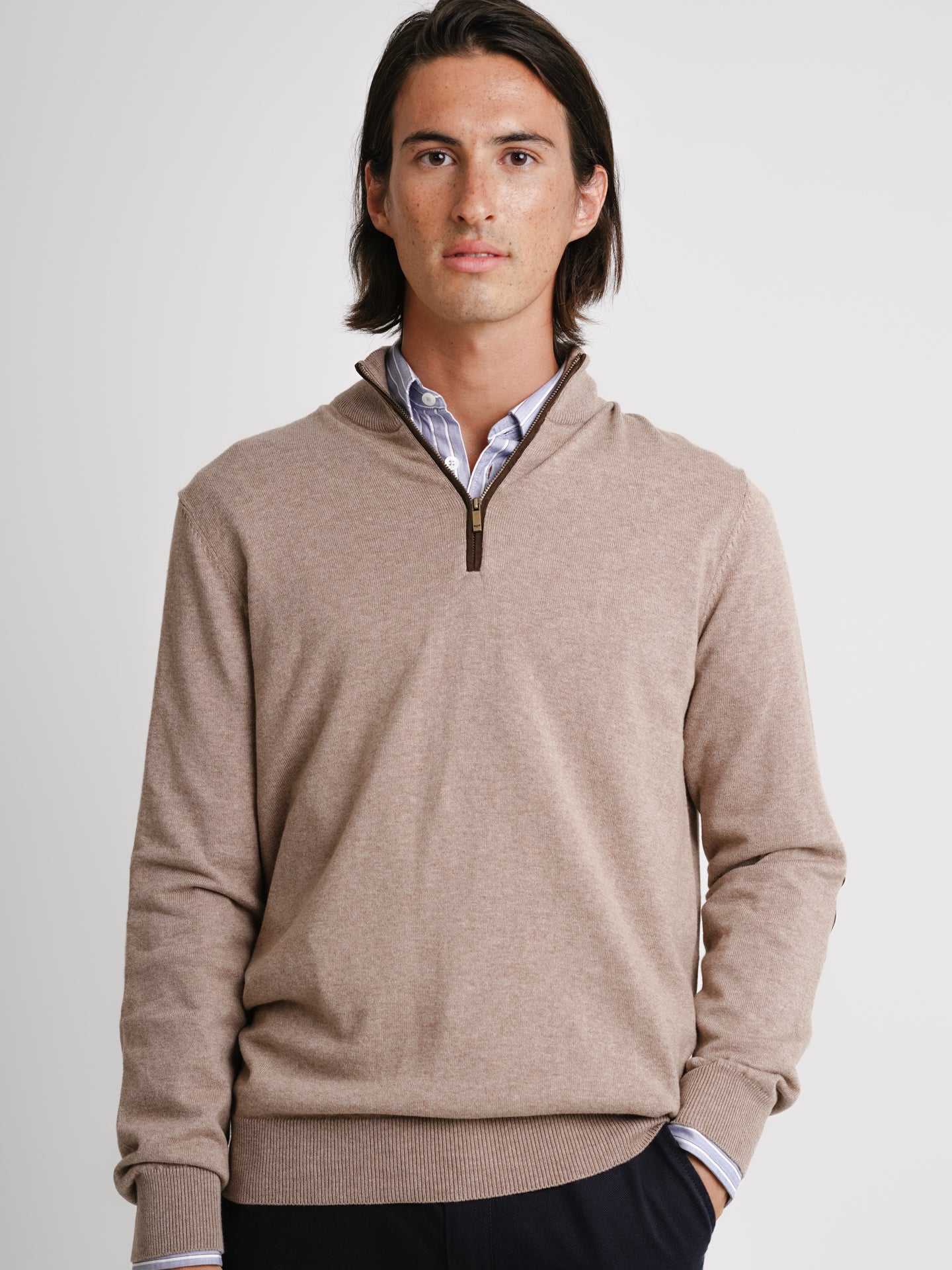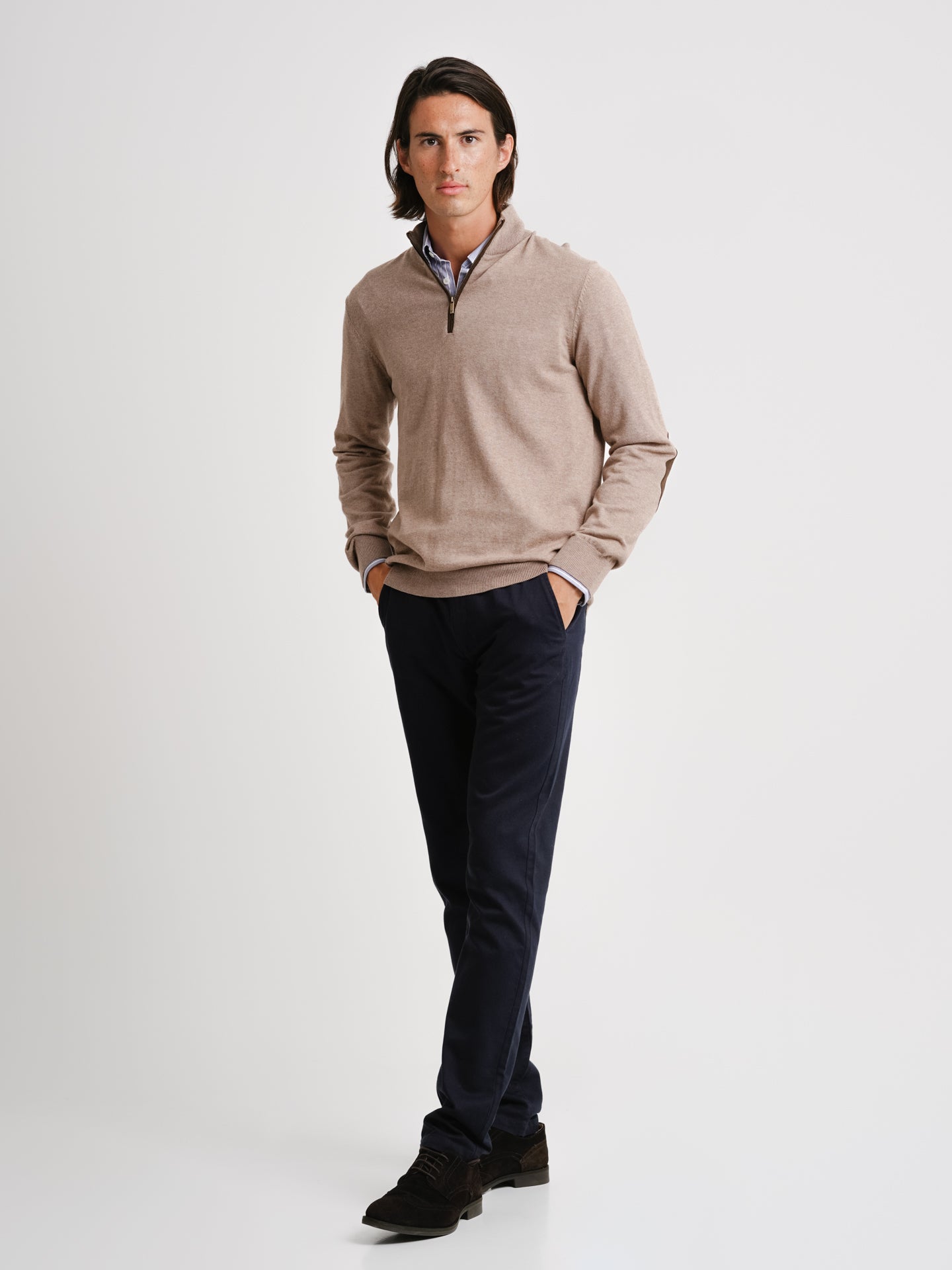Jersey de cachemira fina con coderas de cachemira beige liso