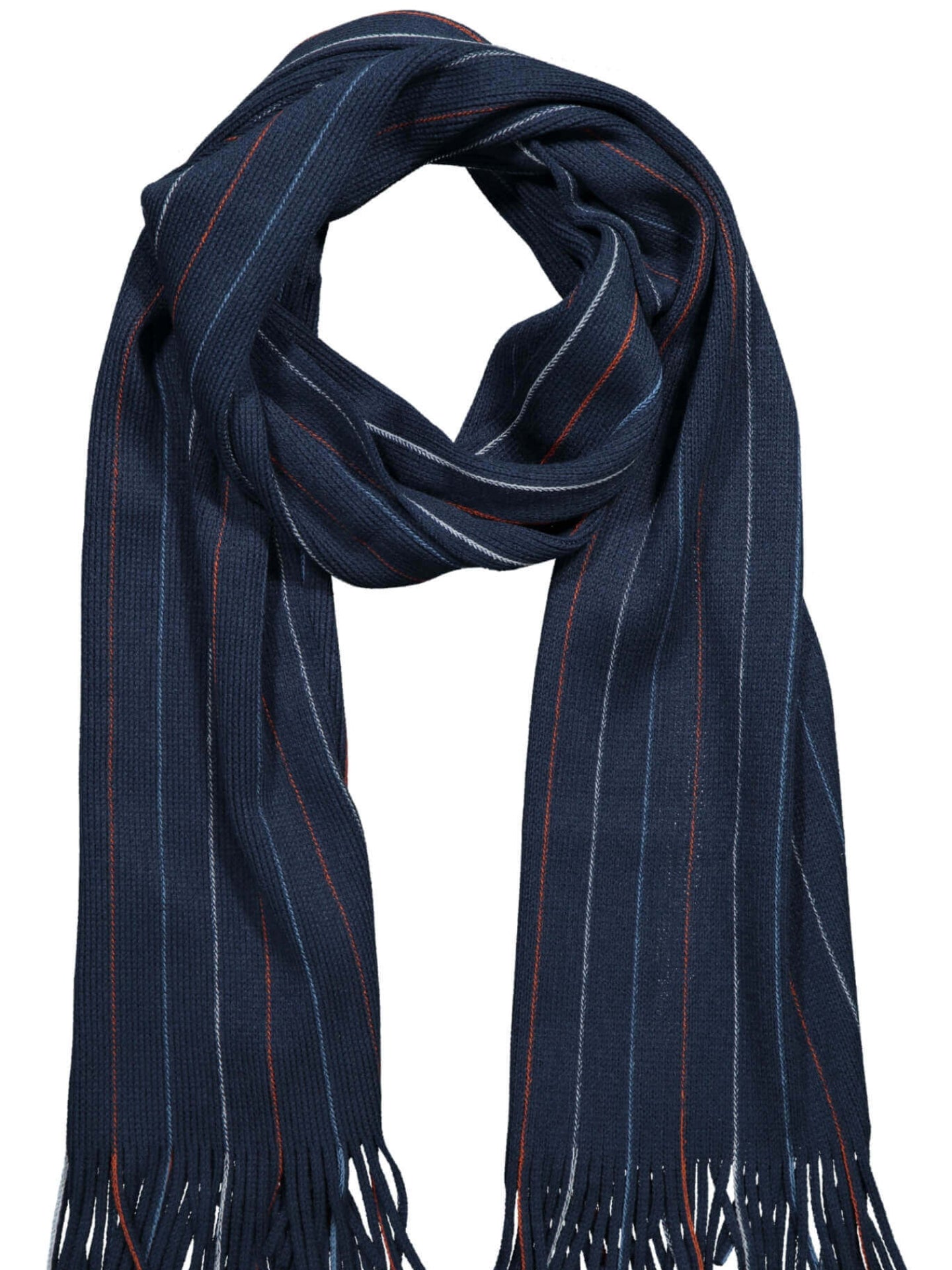 Cachecol riscas finas azul escuro e vermelho. Confortável e aconchegante, ideal para os dias mais frios de inverno.