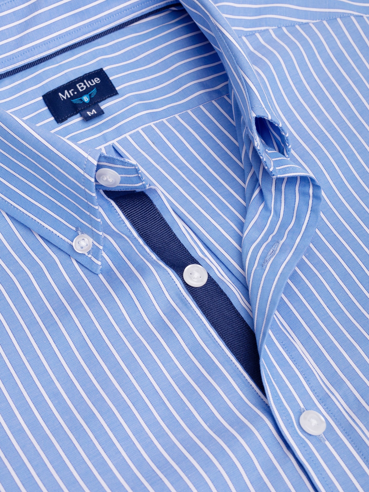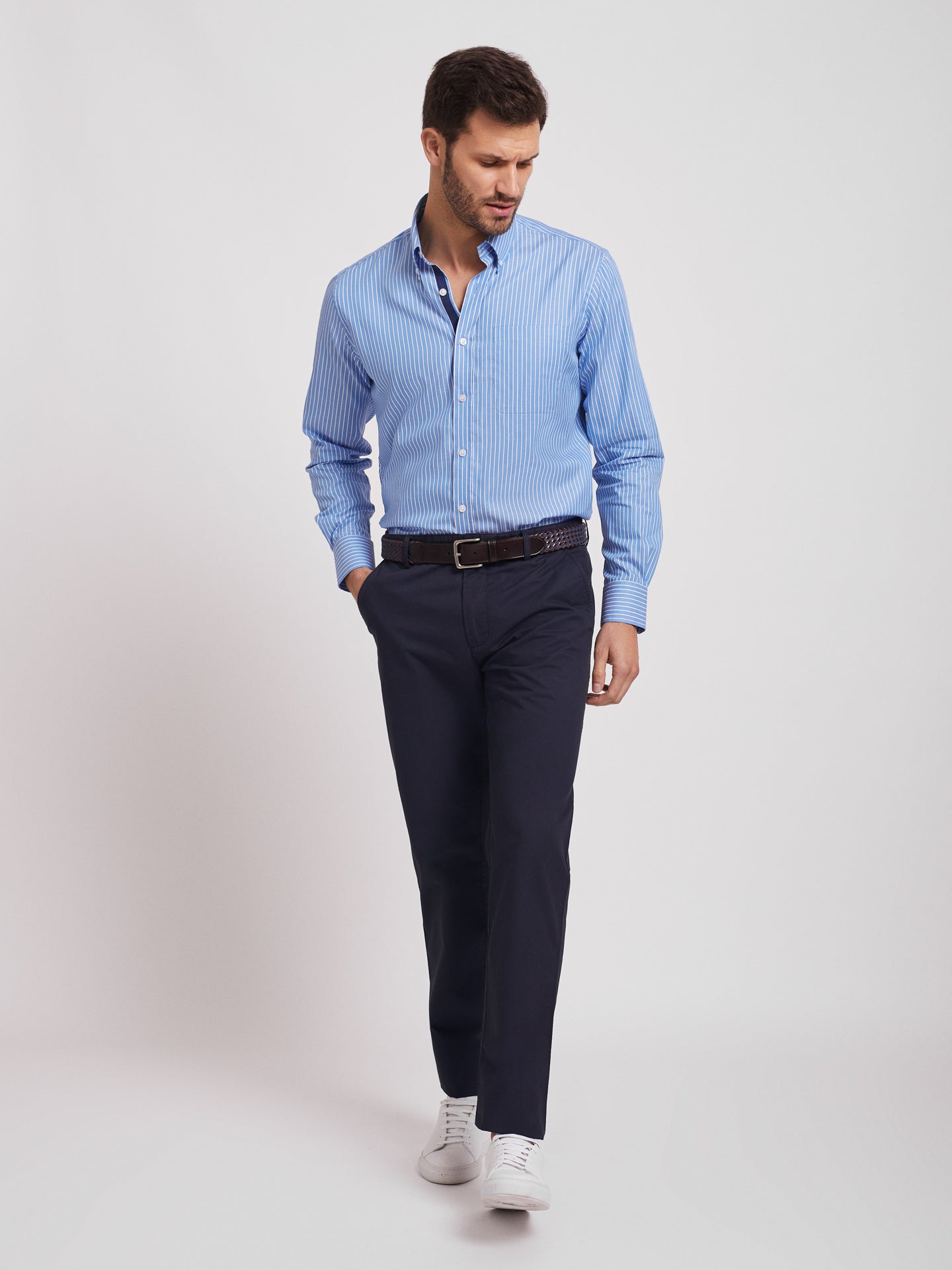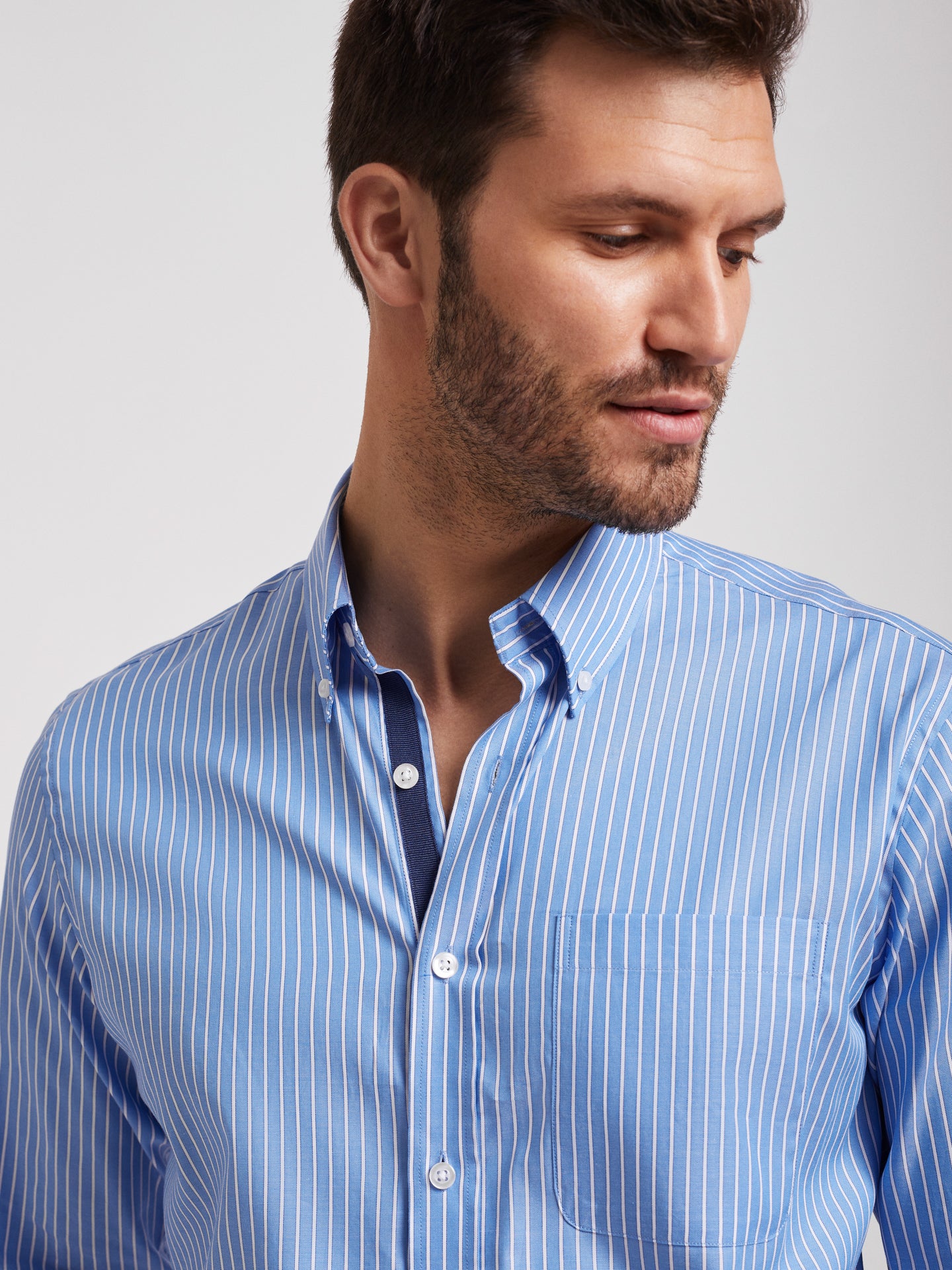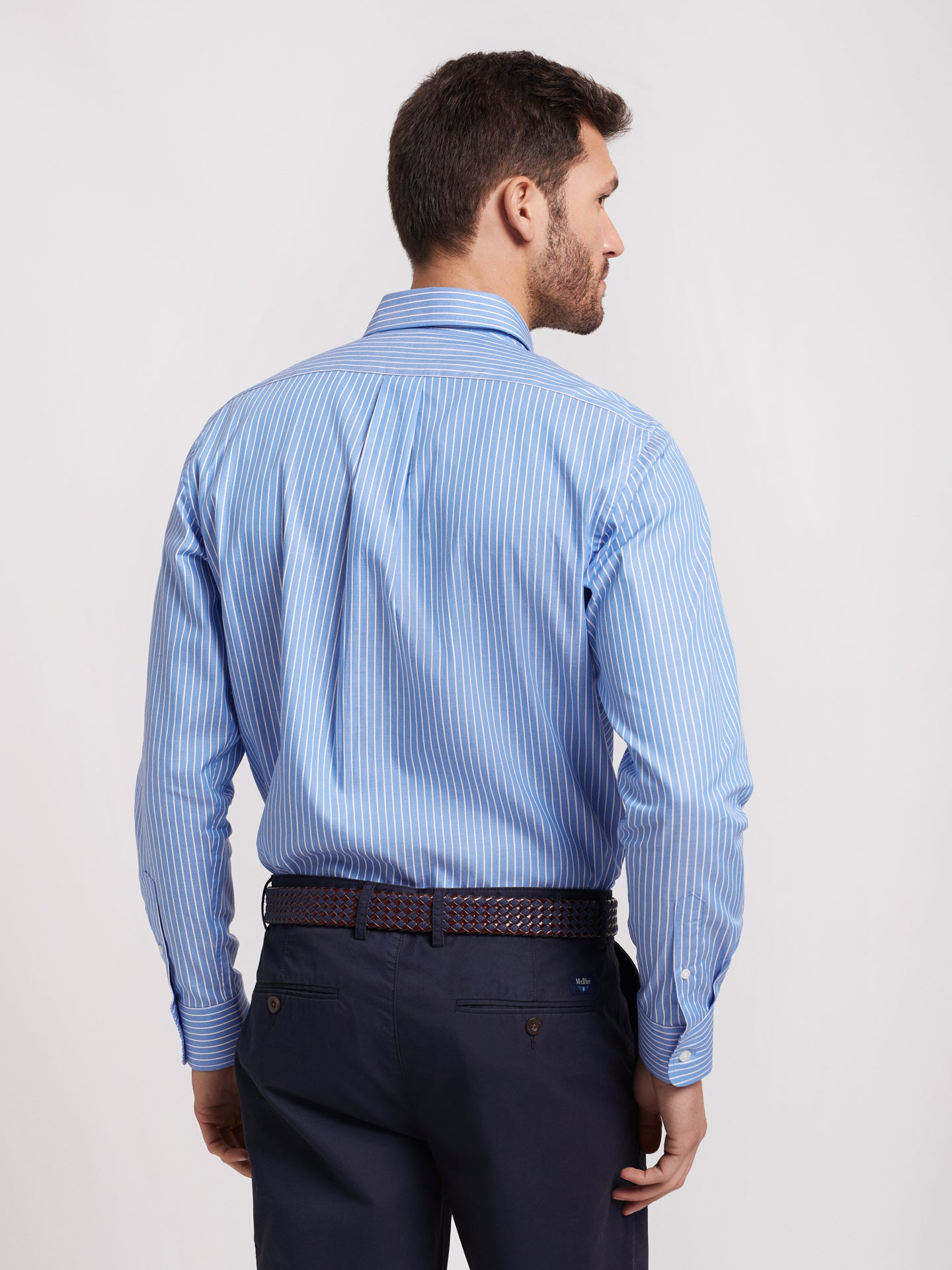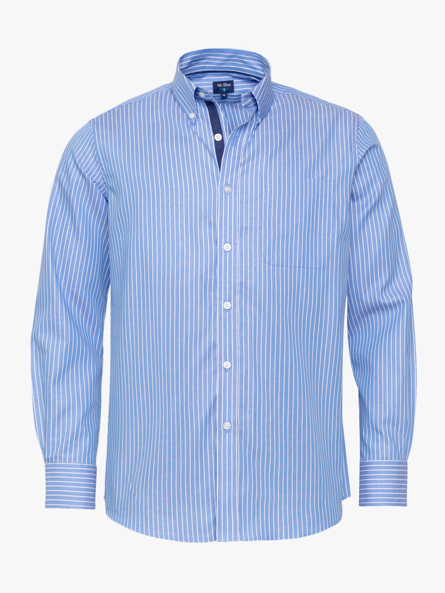 Camisa de algodón a rayas azules y blancas para hombre. Detalle de tapeta azul marino. Ajuste regular. Cuello abotonado. Cierre con botones. puños abotonados