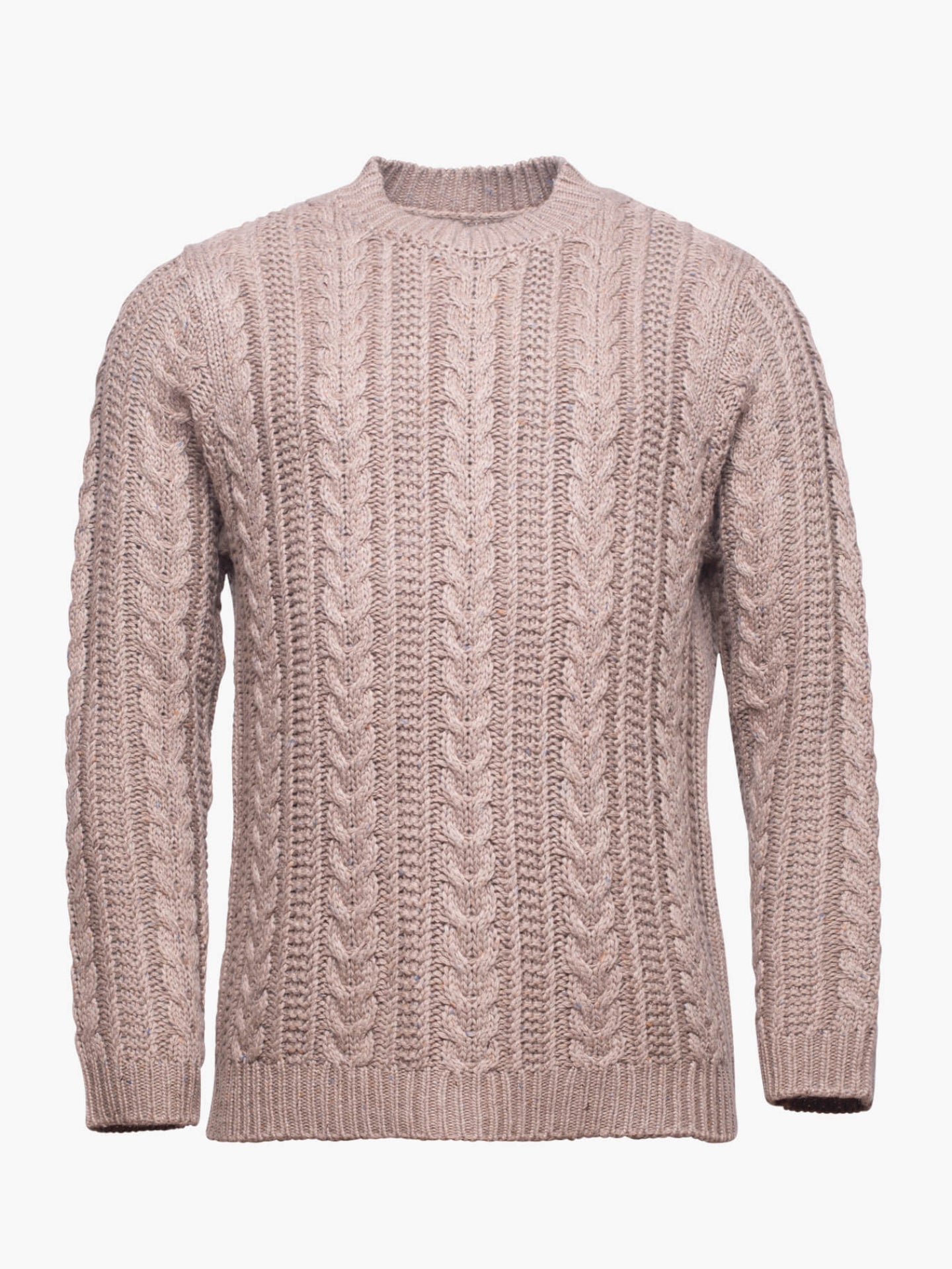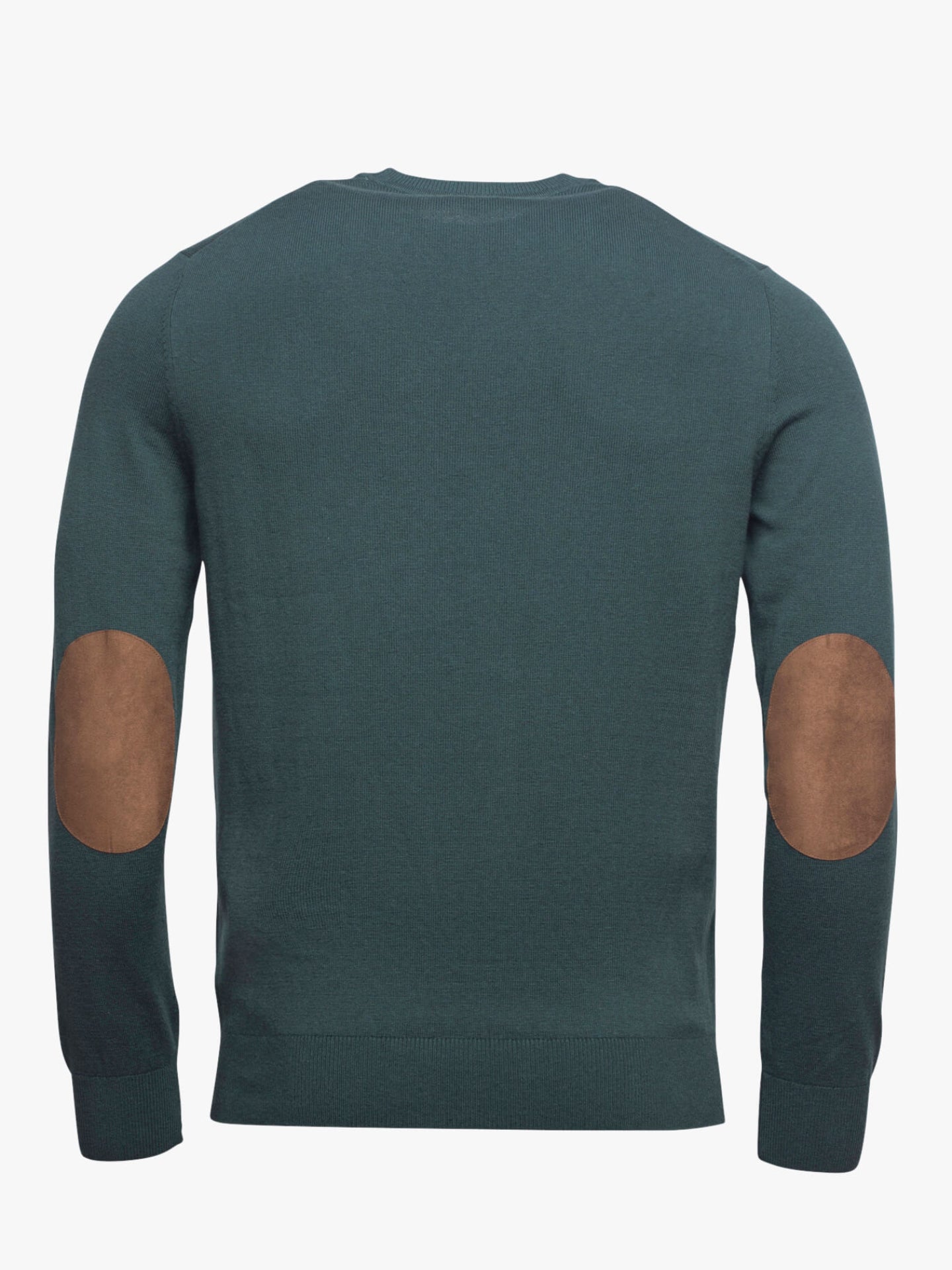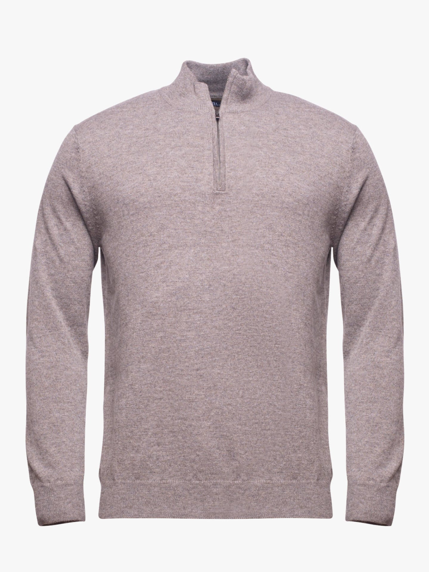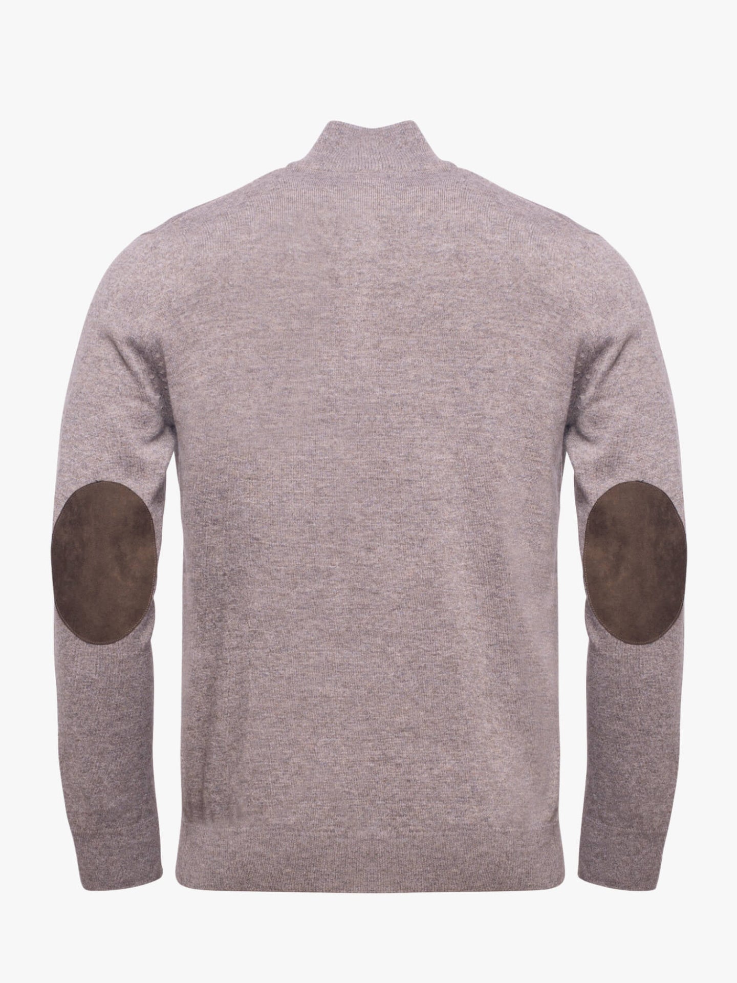 Suéter liso de color beige grisáceo con cuello con cremallera y coderas