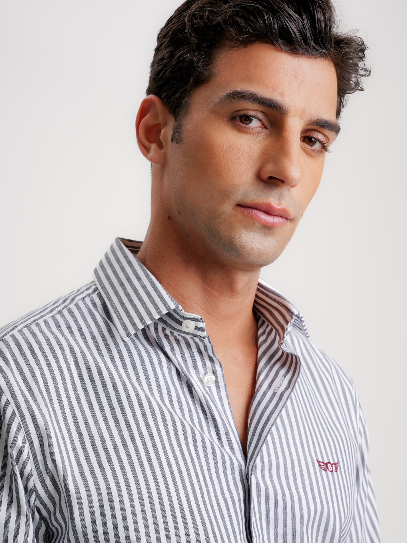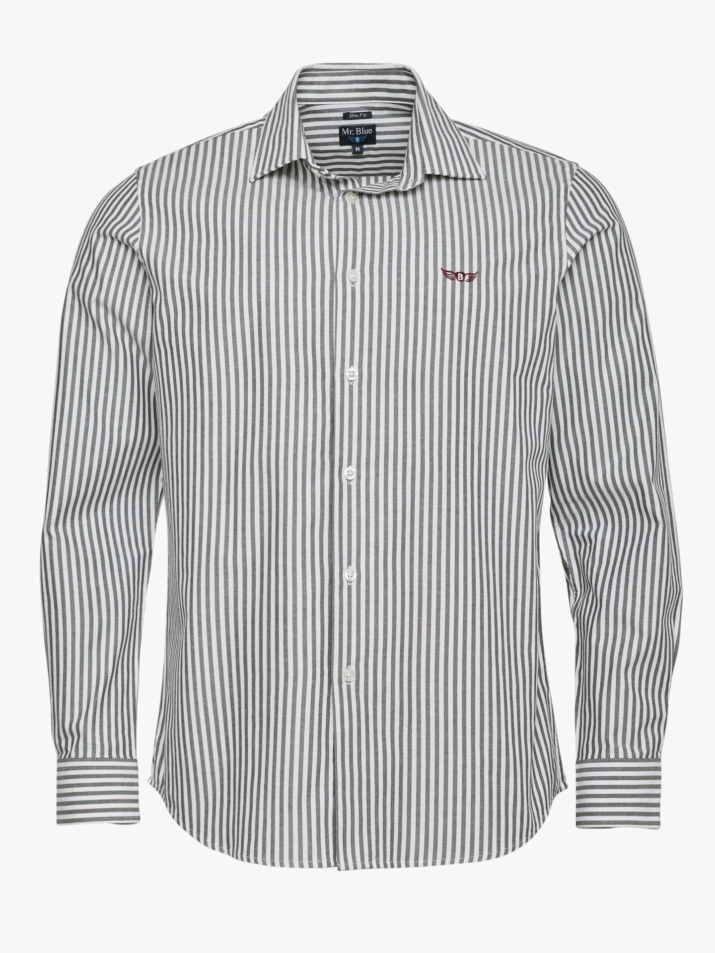 Camisa Oxford de manga larga gris ajustada con logotipo de rayas