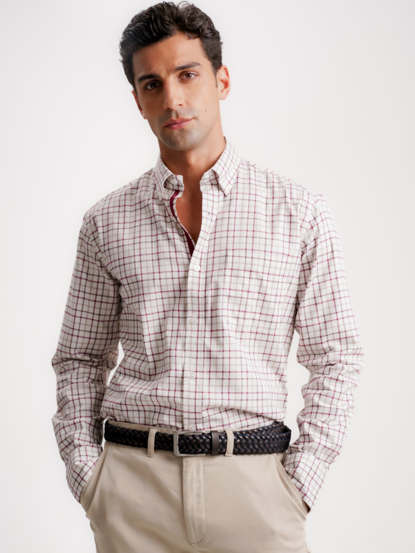 Camisa Regular Fit Vaiela Bege Manga Comprida Com Bolso Com Quadrados