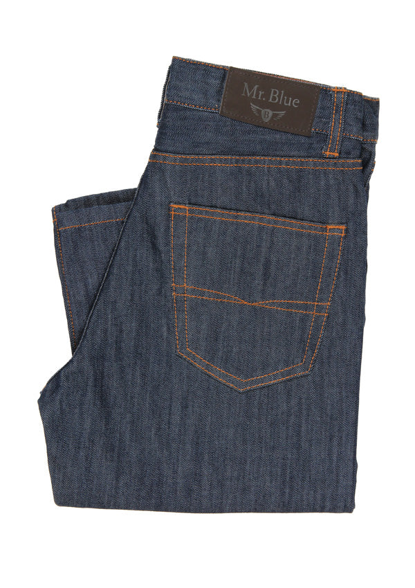 Calças de ganga para homem stone wash azul escuro, confecionadas em tecido 100% algodão. Cintura subida, fecho de botão e fecho de correr oculto por carcela, design de cinco bolsos e presilhas para cinto