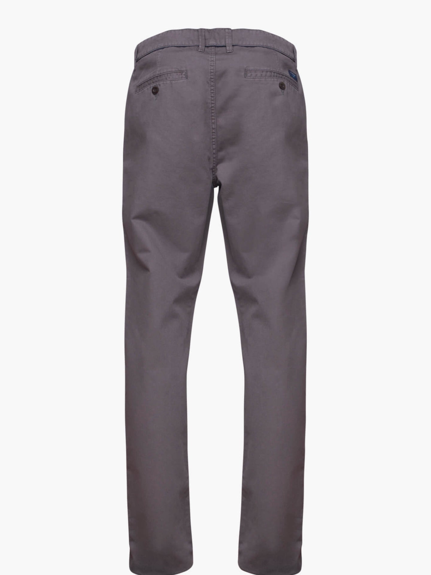 Calças chino para homem cinzento escuro, confecionadas em tecido algodão. Corte slim, fecho de botão e fecho de correr oculto por carcela, dois bolsos laterais, dois bolsos com casa de botão abotoados atrás em contraste e presilhas para cinto.