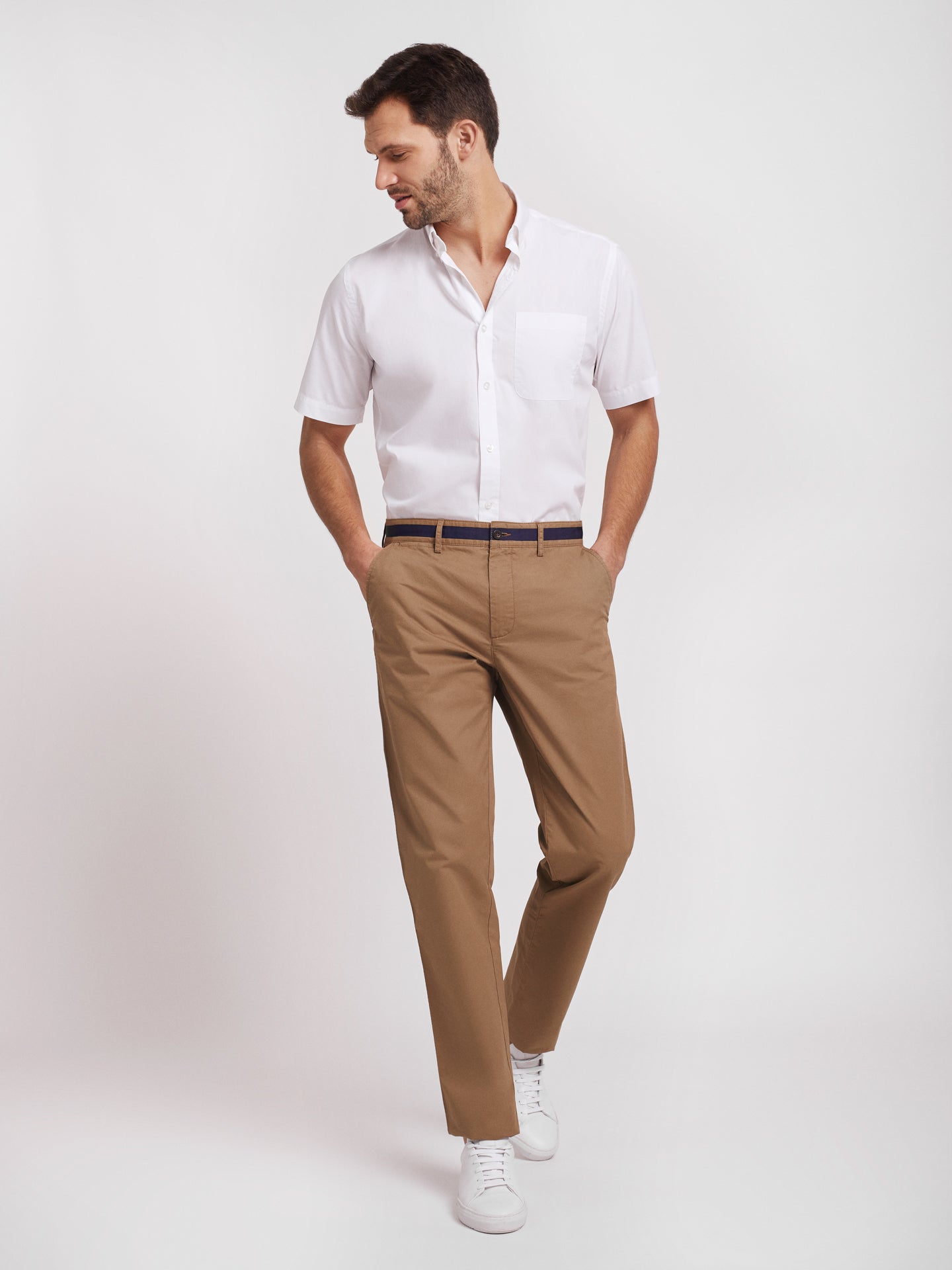 Calças Chino camel homem 100% algodão. Tape no cós azul marinho. Corte regular, fecho de botão e fecho de correr oculto por carcela, dois bolsos laterais e um bolso pequeno. Dois bolsos com casa de botão abotoados atrás e presilhas para cinto.
