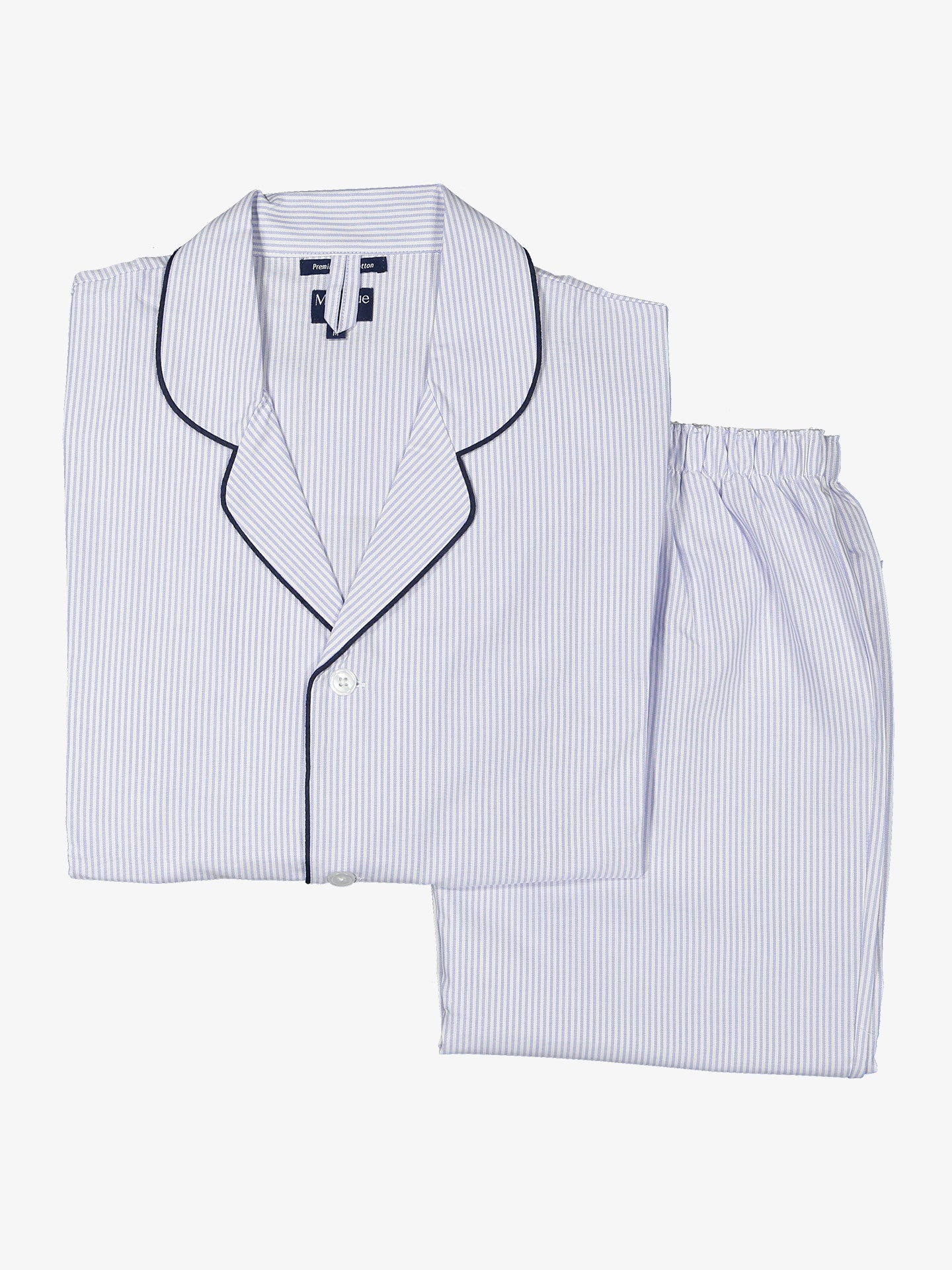 Pijama clássico de homem manga comprida de riscas finas azul claro e branco