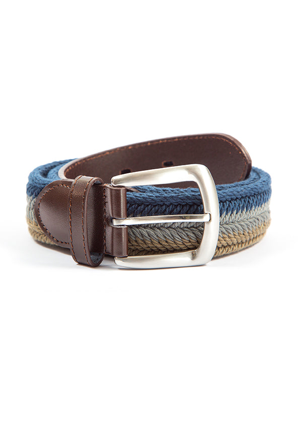 Cinto de pele e tecido com riscas grossas azul claro e fivela prateada