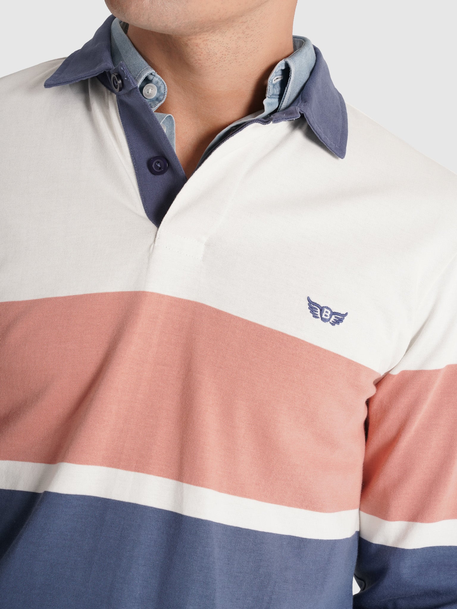 Rugbie Algodão Algodão Azul Manga Comprida Regular Fit Com Logo Riscas