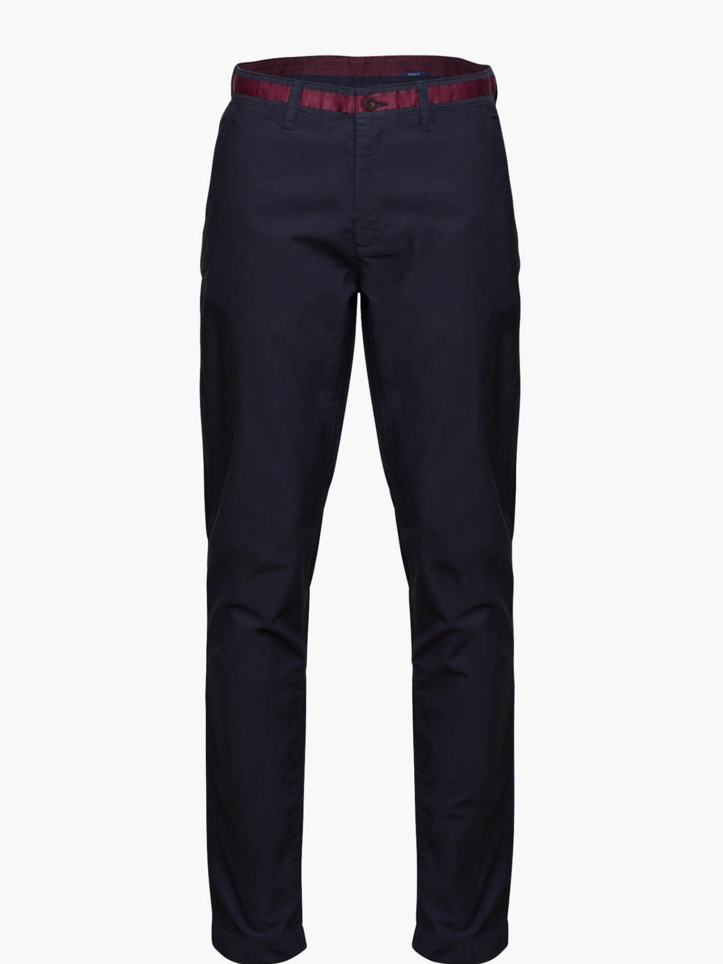 Calças Chinos Homem 100% Algodão com estrutura canelada azul escuro com tape no cós em bordeaux e tape interior cós em pesponto vermelho. Corte Tailored Fit. Muito confortáveis, são a escolha certa para os dias mais quentes.